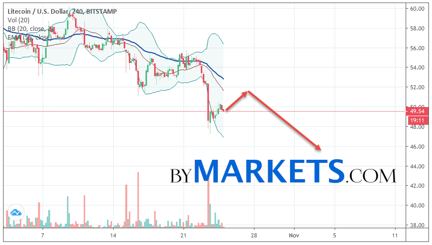 As part of the Litecoin exchange rate forecast, a test level of 51.50 is expected. Where should we expect an attempt to continue the fall of LTC/USD and the further development of the downward trend. The purpose of this movement is the area near the level of 45.80. The conservative sales area for Litecoin is located near the upper border of the Bollinger Bands indicator strip at 56.20.