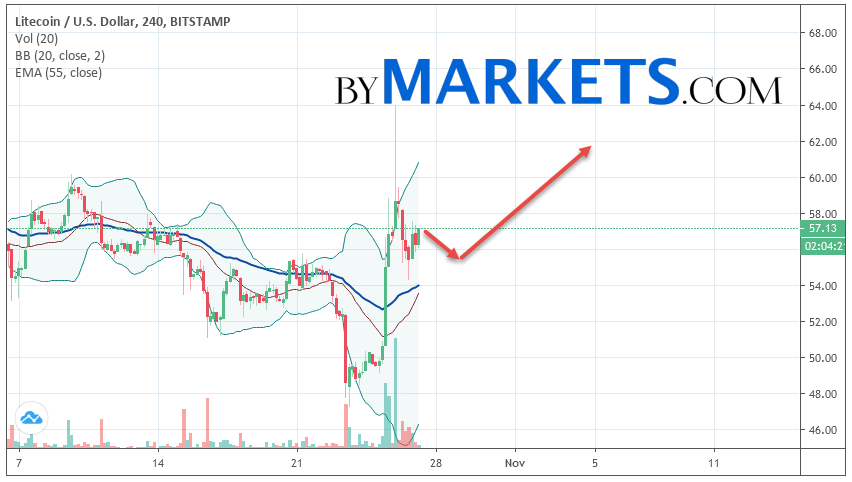 Cryptocurrency Litecoin (LTC/USD) is trading at 57.13. Cryptocurrency quotes are trading below the moving average with a period of 55. This indicates a bullish trend on Litecoin. At the moment, cryptocurrency quotes are moving near the upper border of the Bollinger Bands indicator stripes.