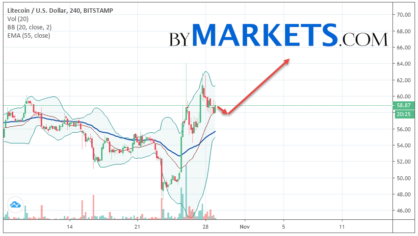 Cryptocurrency Litecoin (LTC/USD) is trading at 58.87. Cryptocurrency quotes are trading below the moving average with a period of 55. This indicates a bullish trend on Litecoin. At the moment, cryptocurrency quotes are moving near the middle border of the Bollinger Bands indicator stripes.