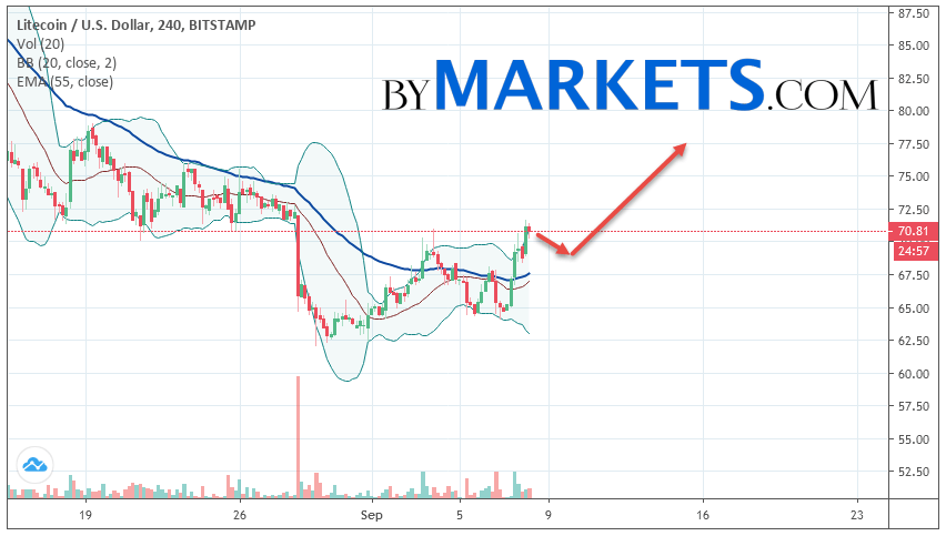 Cryptocurrency Litecoin (LTC/USD) is trading at 70.81. Cryptocurrency quotes are trading below the moving average with a period of 55. This indicates a bullish trend on Litecoin. At the moment, cryptocurrency quotes are moving near the upper border of the Bollinger Bands indicator stripes.