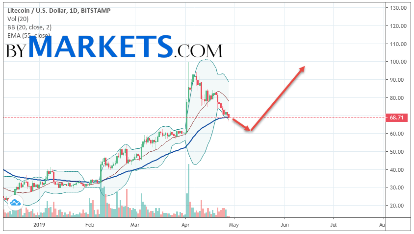 Litecoin (LTC/USD) forecast on April 29 — May 5, 2019 implies a test level of 60.50. Further, growth is expected to continue to the area above the level of 98.20. The conservative area for buying Litecoin is located area of 60.00. The cancellation of the cryptocurrency growth option will be the breakdown of the level of 52.50. In this case, we should expect the continuation of the fall.