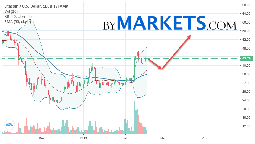 Cryptocurrency Litecoin (LTC/USD) is trading at 43.25. Cryptocurrency quotes are trading below the moving average with a period of 55. This indicates a bullish trend on Litecoin. At the moment, cryptocurrency quotes are moving near the upper border of the Bollinger Bands indicator.