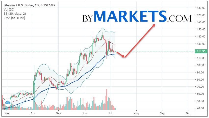 Cryptocurrency Litecoin (LTC/USD) is trading at 119.36. Cryptocurrency quotes are trading below the moving average with a period of 55. This indicates a bullish trend on Litecoin. At the moment, cryptocurrency quotes are moving near the lower border of the Bollinger Bands indicator bands.