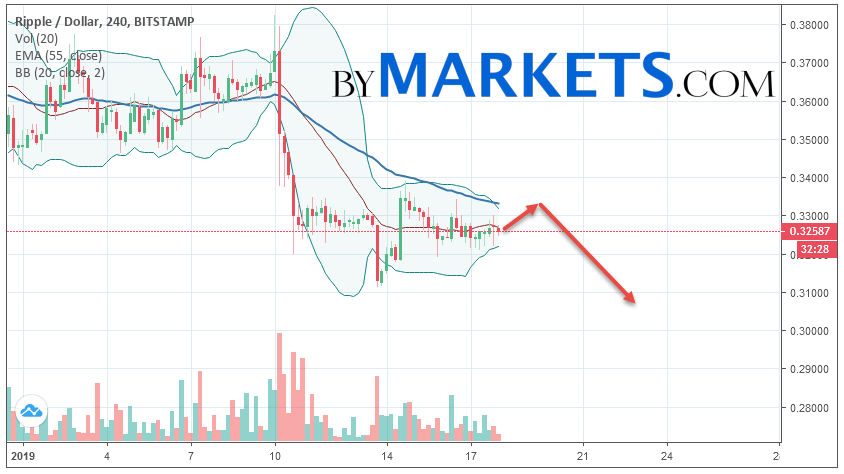 As part of the Ripple course forecast, a test level of 0.3320 is expected. Where should we expect an attempt to continue the fall of XRP/USD and the further development of the downward trend. The purpose of this movement is the area near the level of 0.3080. The conservative sales area for Ripple is located near the upper border of the Bollinger Bands indicator at 0.3350.
