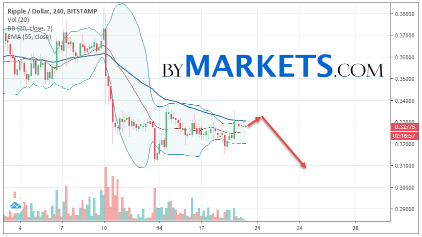 As part of the Ripple course forecast, a test level of 0.3320 is expected. Where should we expect an attempt to continue the fall of XRP/USD and the further development of the downward trend. The purpose of this movement is the area near the level of 0.3080. The conservative sales area for Ripple is located near the upper border of the Bollinger Bands indicator at 0.3350.