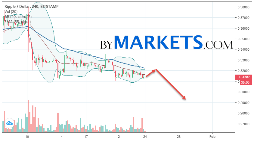 Cryptocurrency Ripple (XRP/USD) is trading at 0.3138. Cryptocurrency quotes are trading below the moving average with a period of 55. This indicates a bearish trend on Ripple. At the moment, cryptocurrency quotes are moving near the lower border of the Bollinger Bands indicator bands.