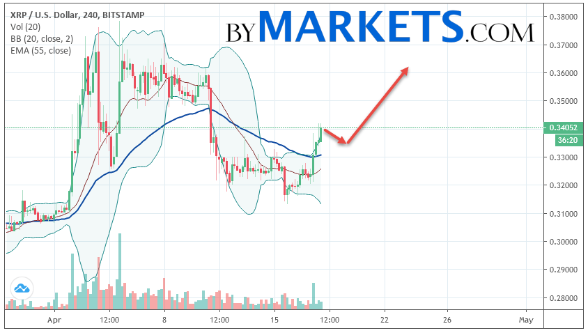 Cryptocurrency Ripple (XRP/USD) is trading at 0.3405. Cryptocurrency quotes are trading above the moving average with a period of 55. This indicates a bullish trend on Ripple. At the moment, cryptocurrency quotes are moving near the upper border of the Bollinger Bands indicator.