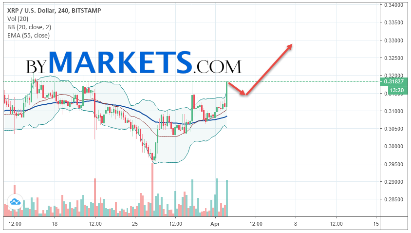 Cryptocurrency Ripple (XRP/USD) is trading at 0.3182. Cryptocurrency quotes are trading above the moving average with a period of 55. This indicates a bullish trend on Ripple. At the moment, cryptocurrency quotes are moving near the upper border of the Bollinger Bands indicator.