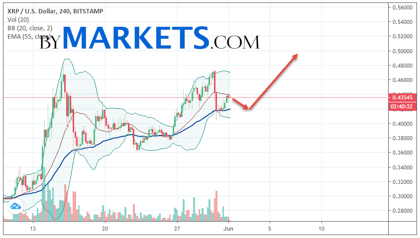 Cryptocurrency Ripple (XRP/USD) is trading at 0.4354. Cryptocurrency quotes are trading above the moving average with a period of 55. This indicates a bullish trend on Ripple. At the moment, cryptocurrency quotes are moving near the middle border of the Bollinger Bands indicator.