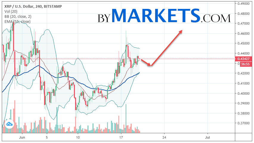 Cryptocurrency Ripple (XRP/USD) is trading at 0.4342. Cryptocurrency quotes are trading above the moving average with a period of 55. This indicates a bullish trend on Ripple. At the moment, cryptocurrency quotes are moving near the middle border of the Bollinger Bands indicator.