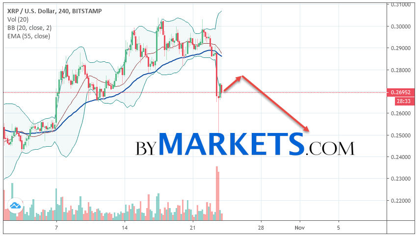Cryptocurrency Ripple (XRP/USD) is trading at 0.2695. Cryptocurrency quotes are trading below the moving average with a period of 55. This indicates a bearish trend on Ripple. At the moment, cryptocurrency quotes are moving near the lower border of the Bollinger Bands indicator stripes.