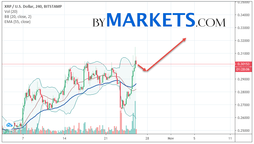As part of the Ripple course forecast, a test level of 0.2960 is expected. Where should we expect an attempt to continue the growth of XRP/USD and the further development of the upward trend. The purpose of this movement is the area near the level of 0.3210. The conservative buying area for Ripple is located near the lower border of the Bollinger Bands indicator strip at 0.2600.