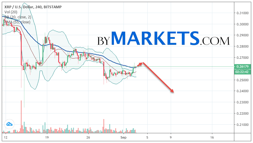 Cryptocurrency Ripple (XRP/USD) is trading at 0.2617. Cryptocurrency quotes are trading below the moving average with a period of 55. This indicates a bearish trend on Ripple. At the moment, cryptocurrency quotes are moving near the upper border of the Bollinger Bands indicator stripes.