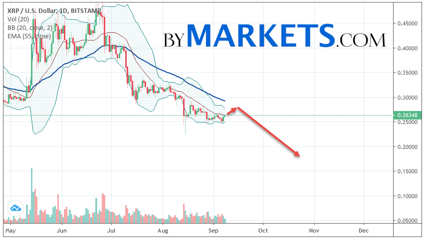 Cryptocurrency Ripple (XRP/USD) is trading at 0.2634. Cryptocurrency quotes are trading below the moving average with a period of 55. This indicates a bearish trend on Ripple. At the moment, cryptocurrency quotes are moving near the middle border of the Bollinger Bands indicator stripes.